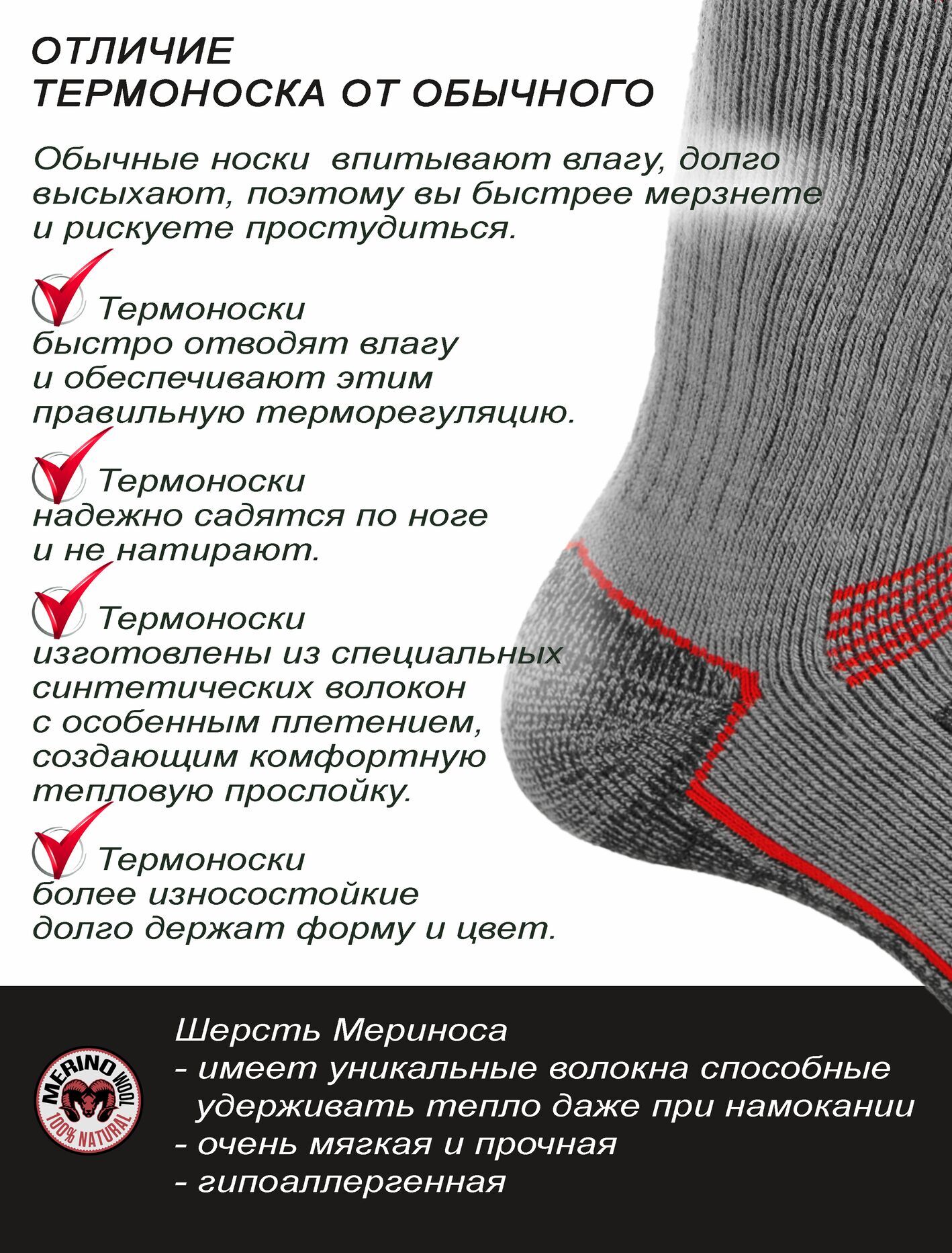 Носки для ежедневного использования в экстремально холодную погоду. Материал – комбинация шерсти Мериноса с акрилом, обеспечивает тепло ногам. Носки мягкие и износостойкие. Укрепленные носок и пятка. Ступня имеет специальную вязку для поддержания стопы при ходьбе. Свод стопы имеет эластичную поддержку.